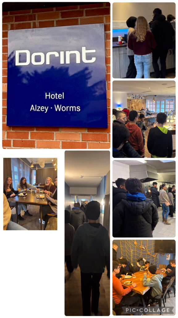 Am 19.12.2025 waren wir im Dorint Hotel Alzey, um eine Hotelführung und mögliche Ausbildungsberufe vorgestellt zu bekommen. Frau Keil hat uns freundlich begrüßt und uns das Hotel gezeigt. Wir durften in Zimmer, Essenräume, Konferenzräume, Küche und vieles mehr hinein schauen. Sie hat uns auch Ausbildungsberufe im Dorint Hotel vorgestellt, wie Restaurantfachfrau /-mann, Hotelfachfrau /- und Köchin sowie weitere Berufsmöglichkeiten. Im Anschluss durften wir noch von dem Frühstücksbuffet essen und trinken. Darüber haben wir uns sehr gefreut. Ein kleines Abschiedsgeschenk haben wir auch noch erhalten, das war sehr nett.